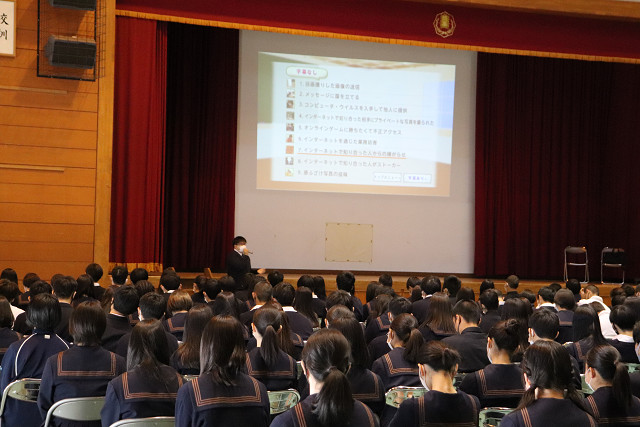 4月9日に館林警察署の方を講師にお招きして、情報モラル講習会を行いました。スマホやSNSに関するトラブルに焦点を当てた講習であり、生徒も身近な危険性によく耳を傾けていました。