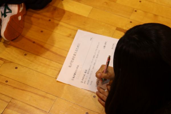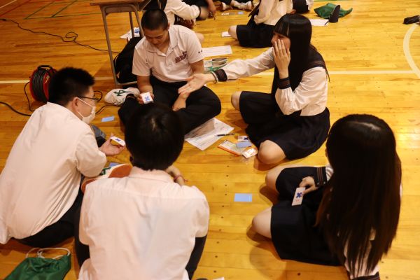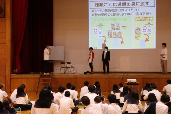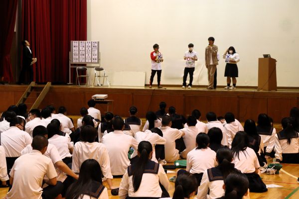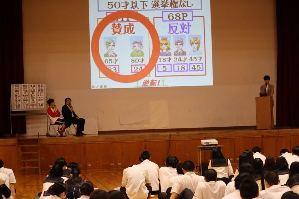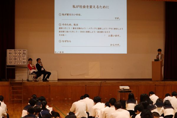 お笑い芸人の方々が司会やコメンテーターとして進め、笑いを交えながら分かりやすく選挙について話をしてくださいました。途中、代表生徒や教員が登壇しての実演や、グループワークを通じて、投票し自分の意見を示すことの大切さを学びました。