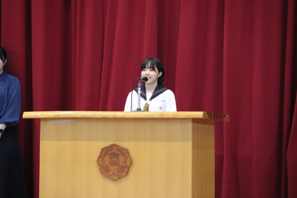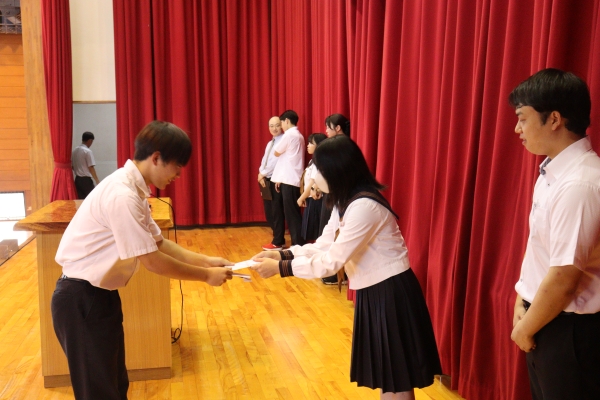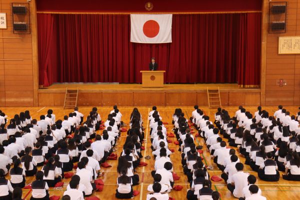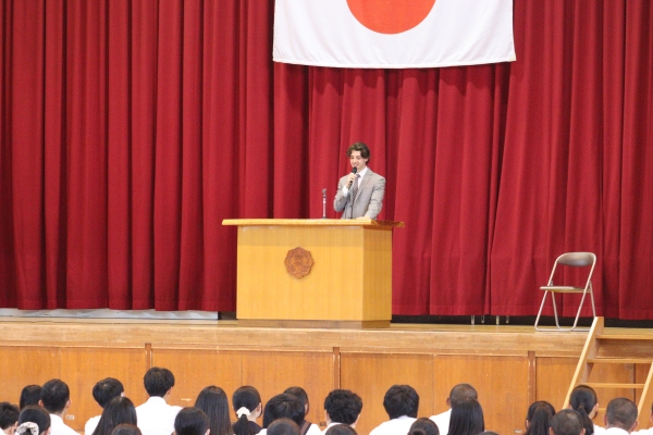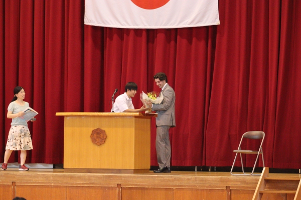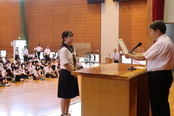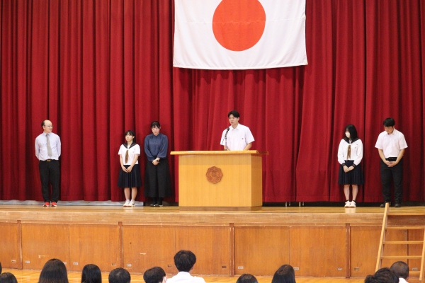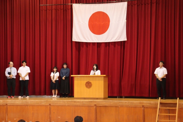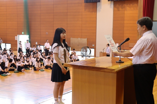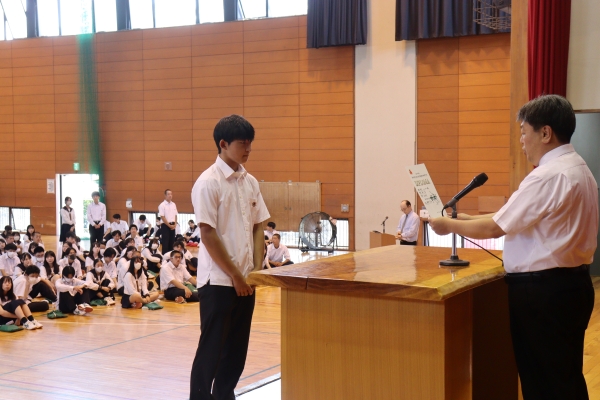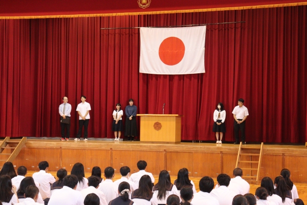校長先生の式辞、ALTのリー先生の退任式、表彰、壮行会を行い、最後は生徒指導主事講話という内容でした。この1学期は、1年生にとっては初めての高校生活で新たな環境に慣れる3か月、2年生にとってはクラス替えをして新たな気持ちで歩きだした3か月、3年生にとっては最高学年として責任感を持ち進路に向けて動き始めた3か月となりました。行事としては、4年連続での松風祭の開催をして多くの来場者を迎えることができました。