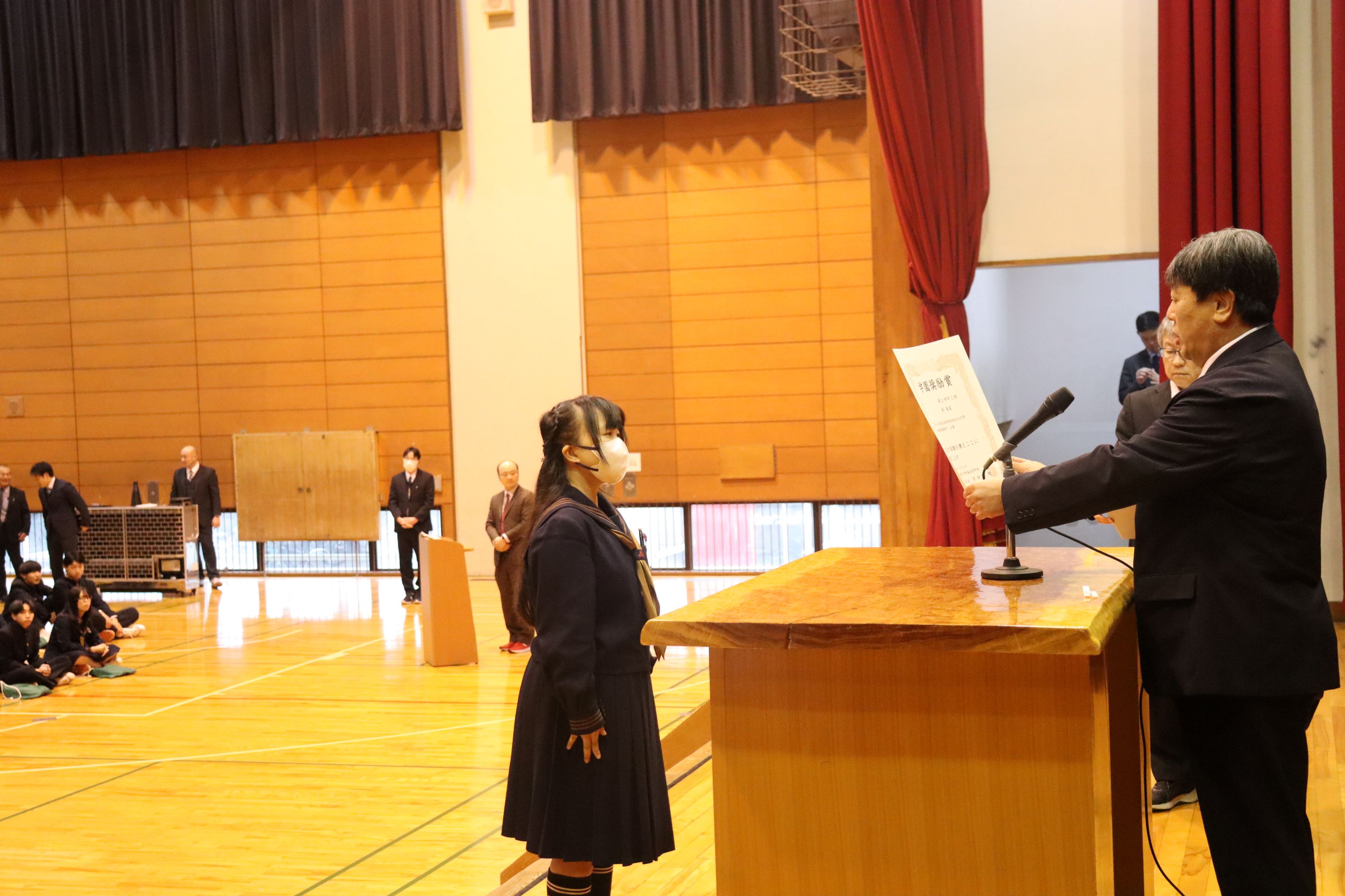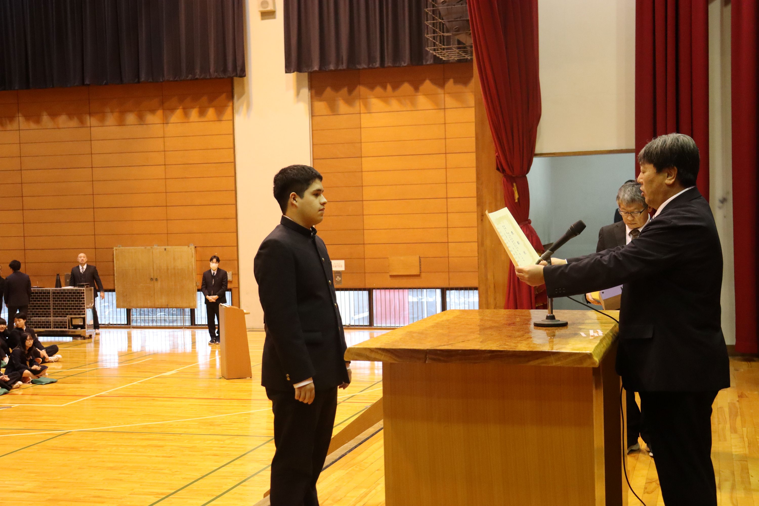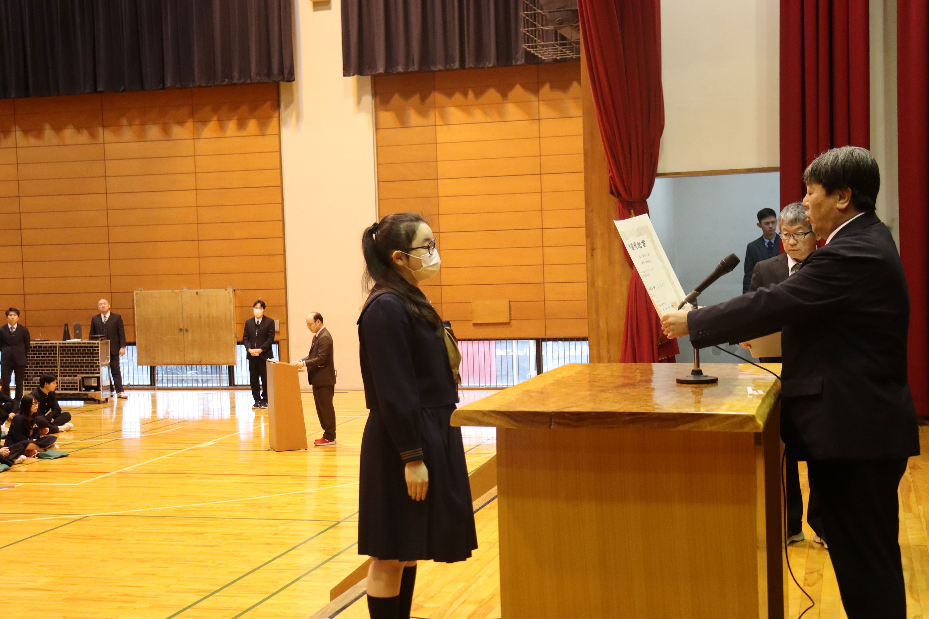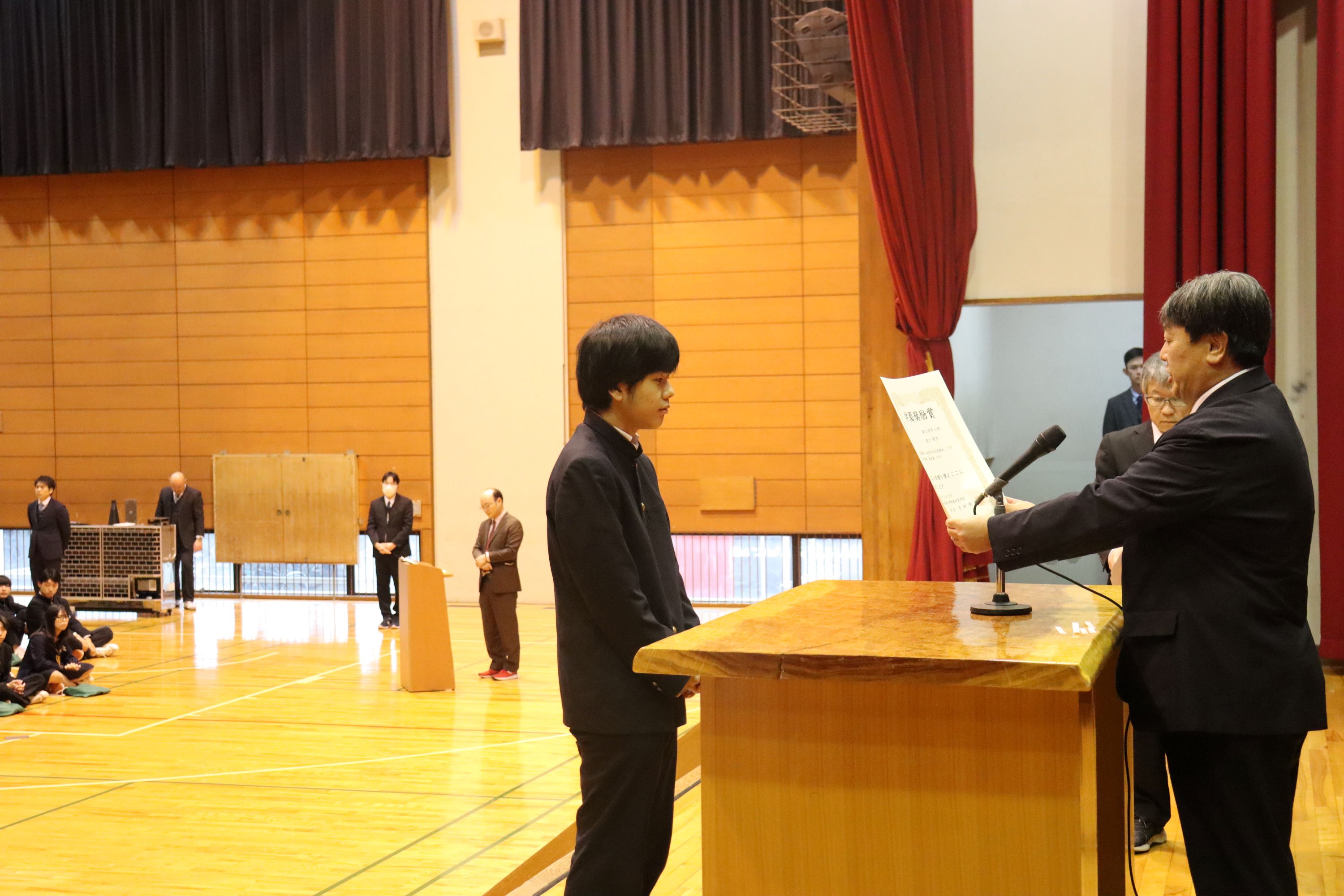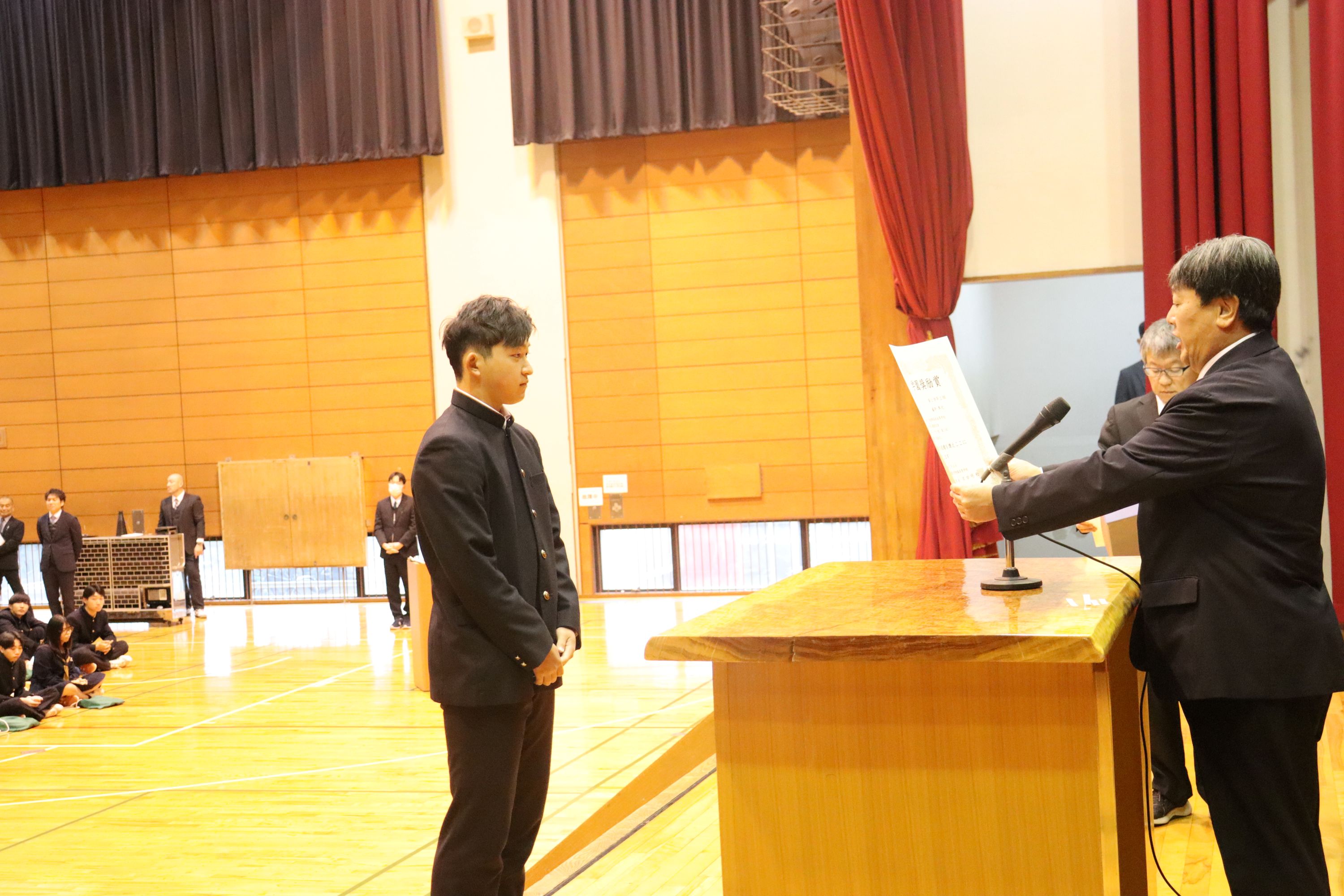 全国大会に出場した和太鼓部や弁論、国スポ入賞の馬術、関東大会出場の水泳部や陸上部の他、標語や作文などで優秀な成績を収めた生徒の表彰や、学業や部活動などで顕著な活躍を見せた生徒を対象とする学園奨励賞の表彰をしました。壇上での表彰は代表者のみでしたが、多くの生徒が表彰に関わっていました。