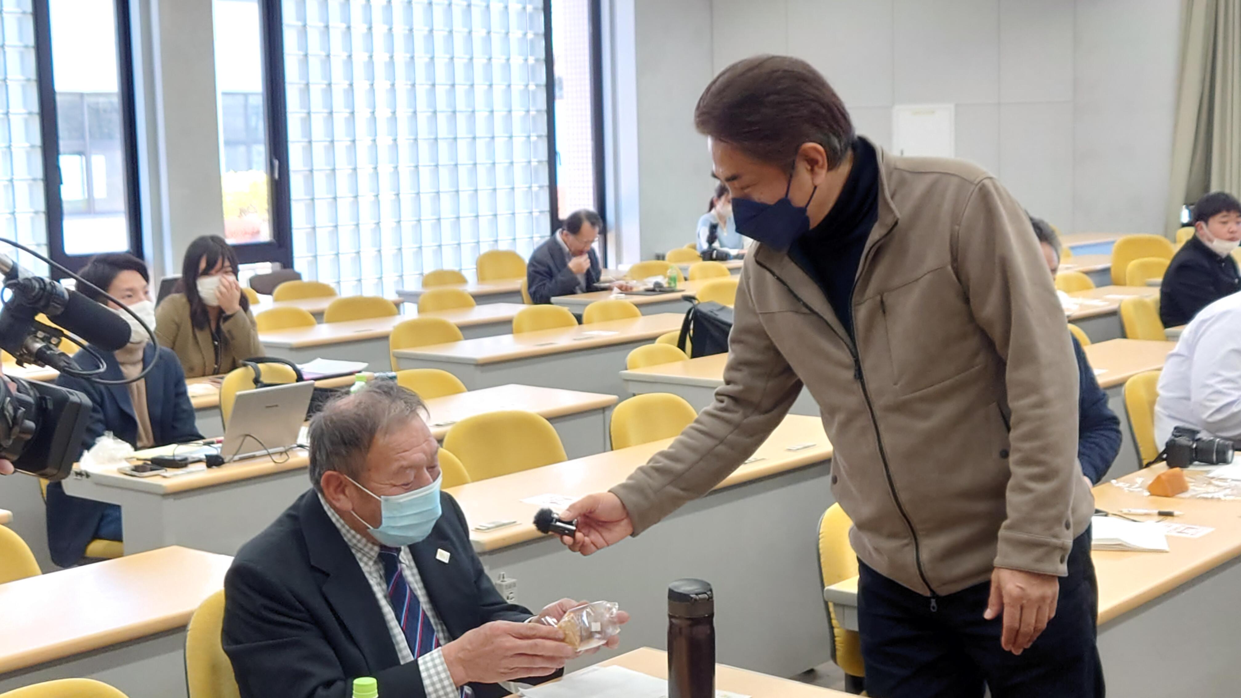 (会場のみなさんと、太田市のイタリア料理店トラットリア・パラヴィーノの鶴田寛哉シェフが試作開発を手掛けたイタリア菓子バーチディダーマを食べながら)