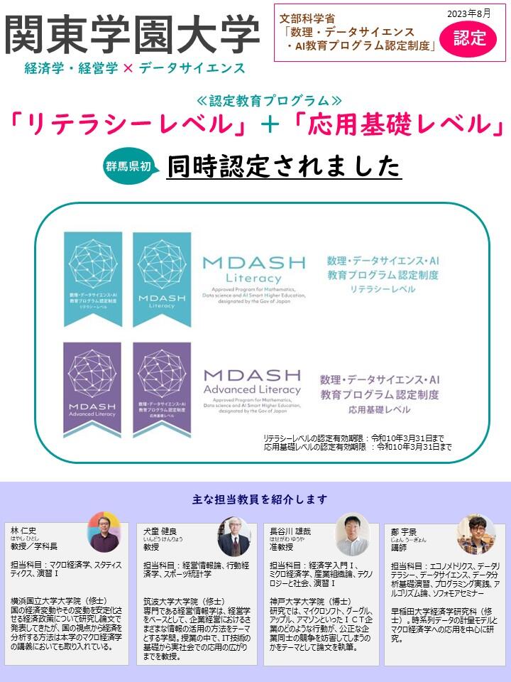 【群馬県初の同時認定】文部科学省が推進する「数理・データサイエンス・AI 教育プログラム認定制度」に認定されました