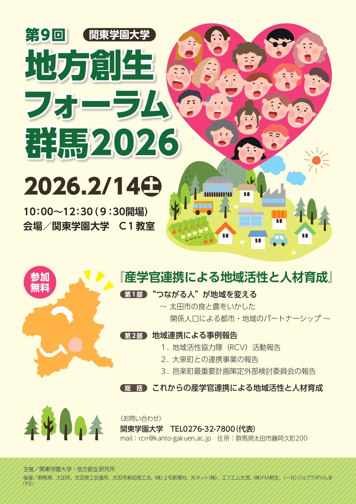 関東学園大学地方創生研究所は、毎年初春に、群馬県・太田市等と連携し、群馬県の活性化をテーマとした産学官連携による「地方創生フォーラム群馬」を開催しています。9回目を迎える今回は「産学官連携による地域活性と人材育成」と題し、下記プログラムで2026年2月14日(土)に開催します。関東学園大学地方創生研究所は、毎年初春に、群馬県・太田市等と連携し、群馬県の活性化をテーマとした産学官連携による「地方創生フォーラム群馬」を開催しています。9回目を迎える今回は「産学官連携による地域活性と人材育成」と題し、下記プログラムで2026年2月14日(土)に開催します。今回は、地域連携と人材育成による地方創生とその可能性を模索するために2部構成のフォーラムを実施します。