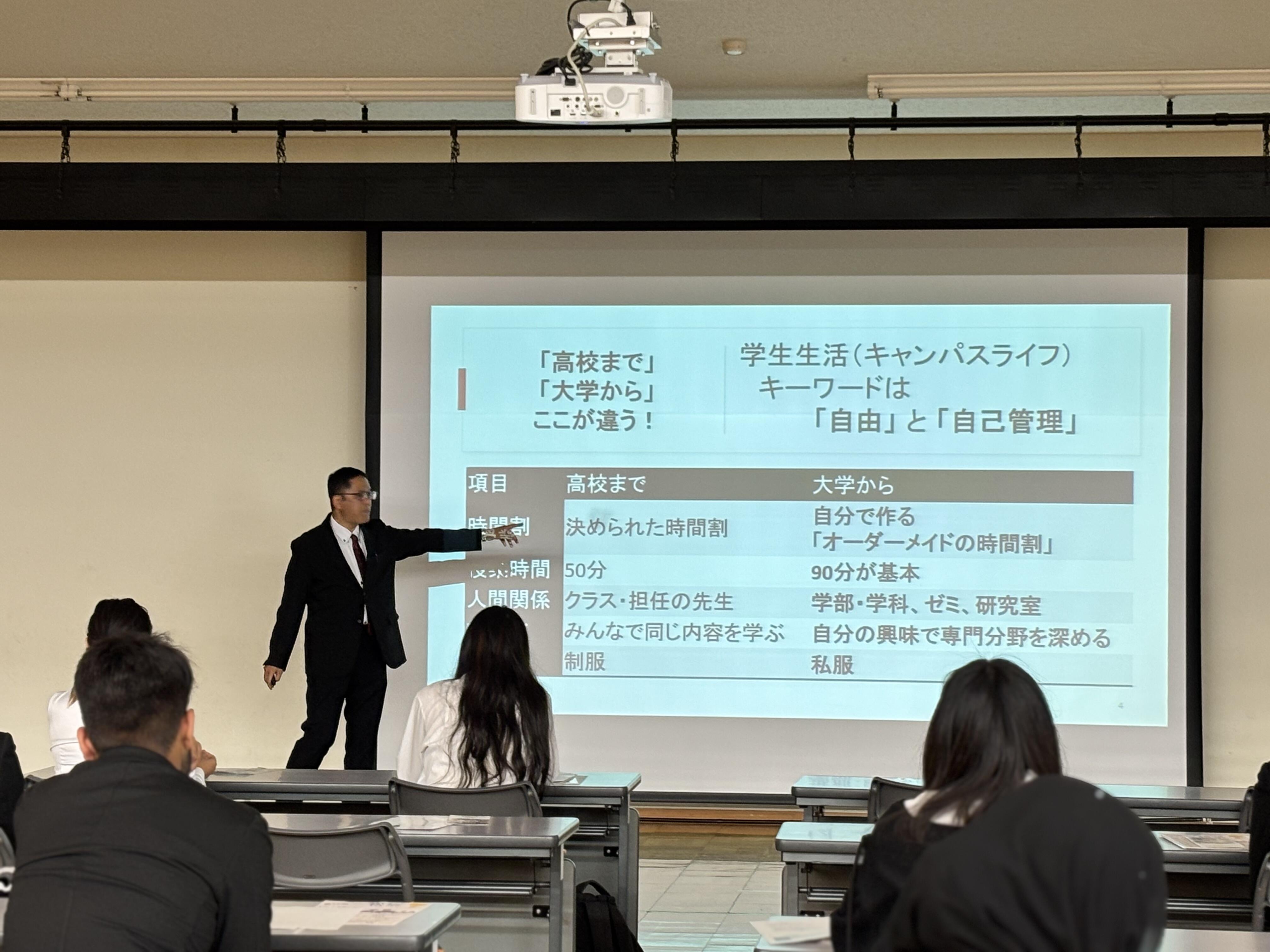 また山根教授からは「ようこそ大学へ」というテーマで、それぞれが自分に合った形で自由な時間を有効活用し、自分を成長させる4年間の学生生活の過ごし方について、時に生徒さんの意見を聞きながらレクチャーしました。専門知識・自己管理・課題解決のための備えや、人間関係の構築など、就職にそなえるためだけの場所ではない、大学4年間で得られる学びや力についても解説しました。