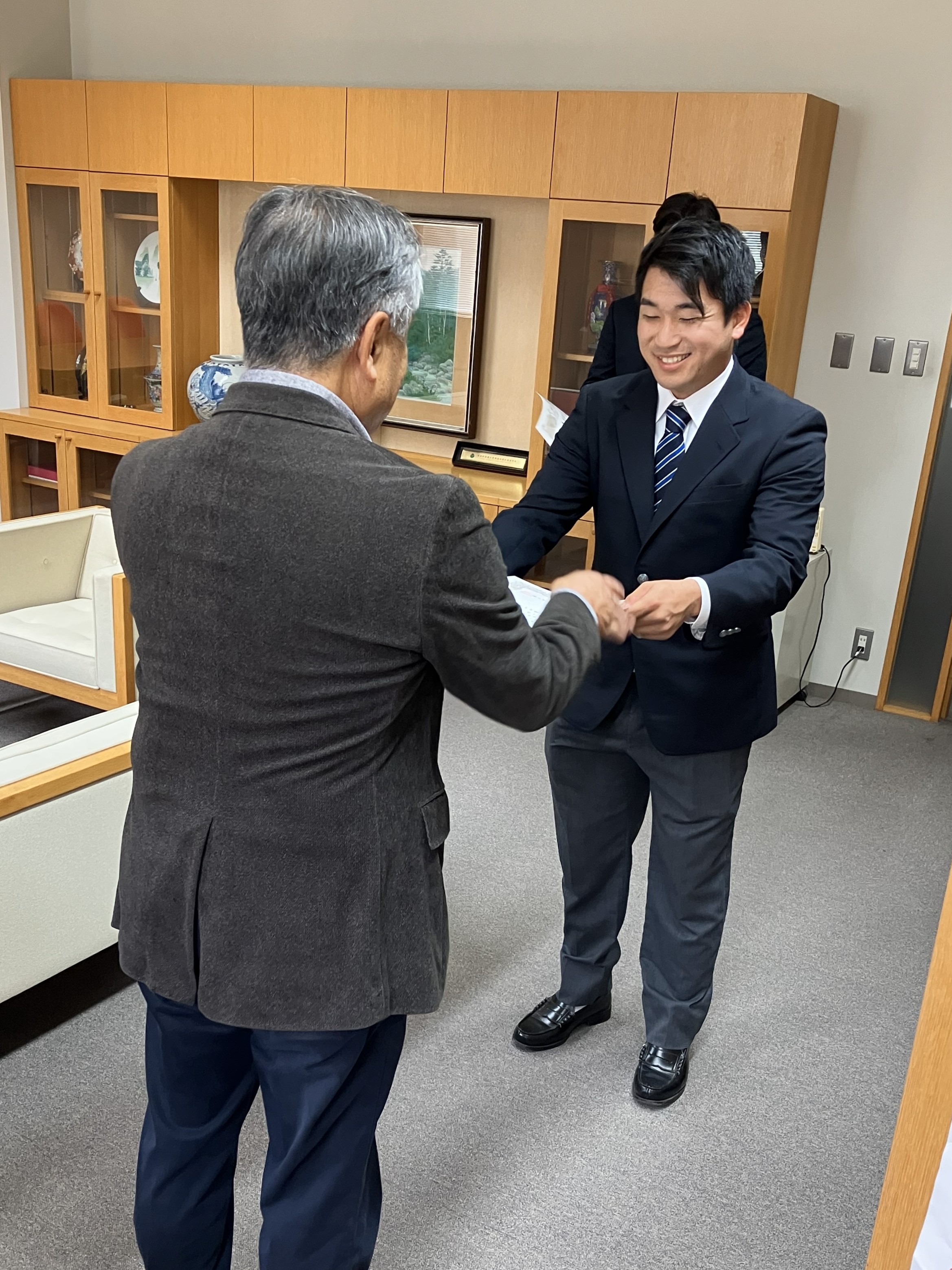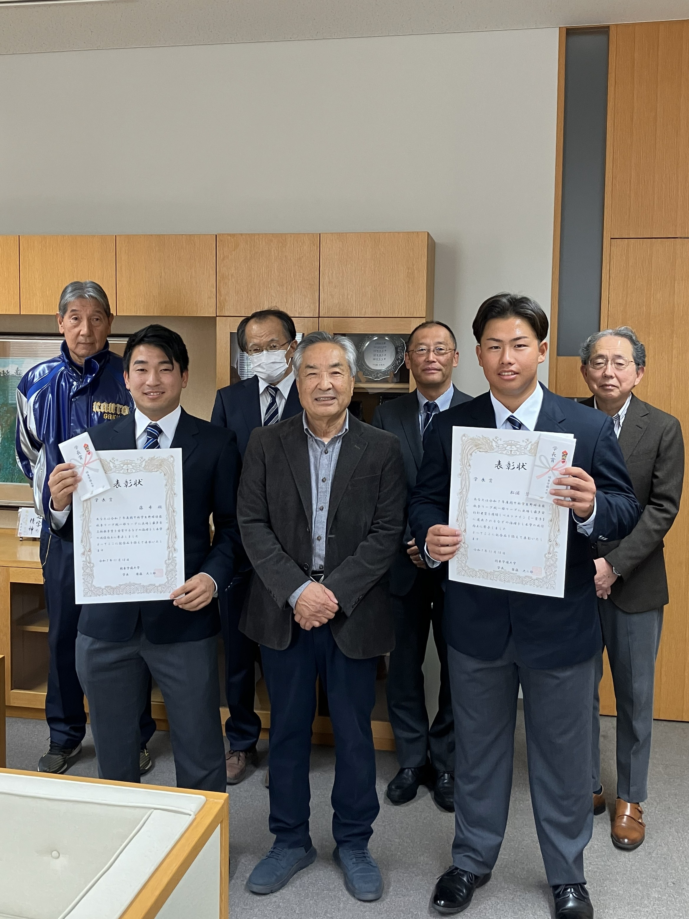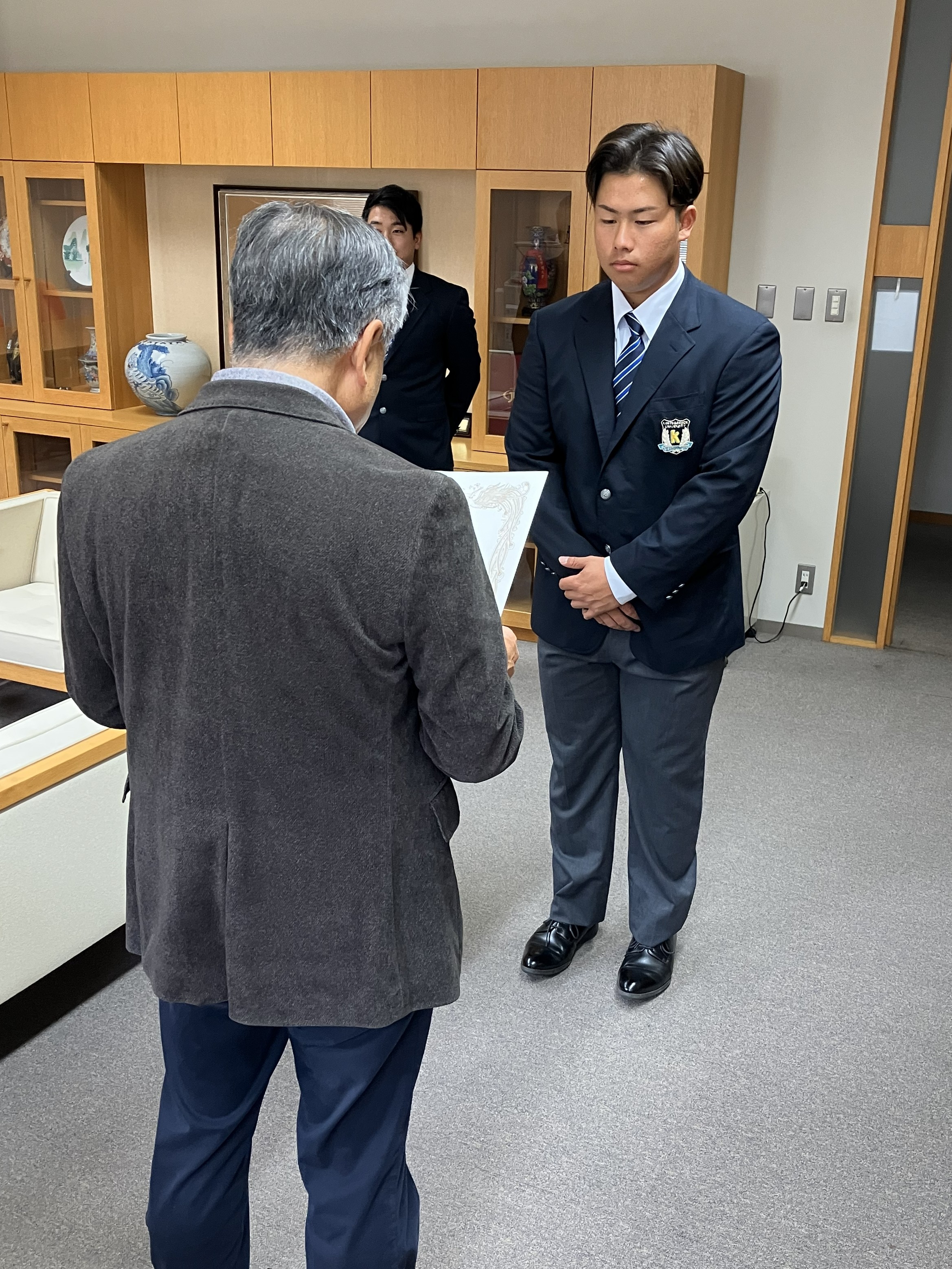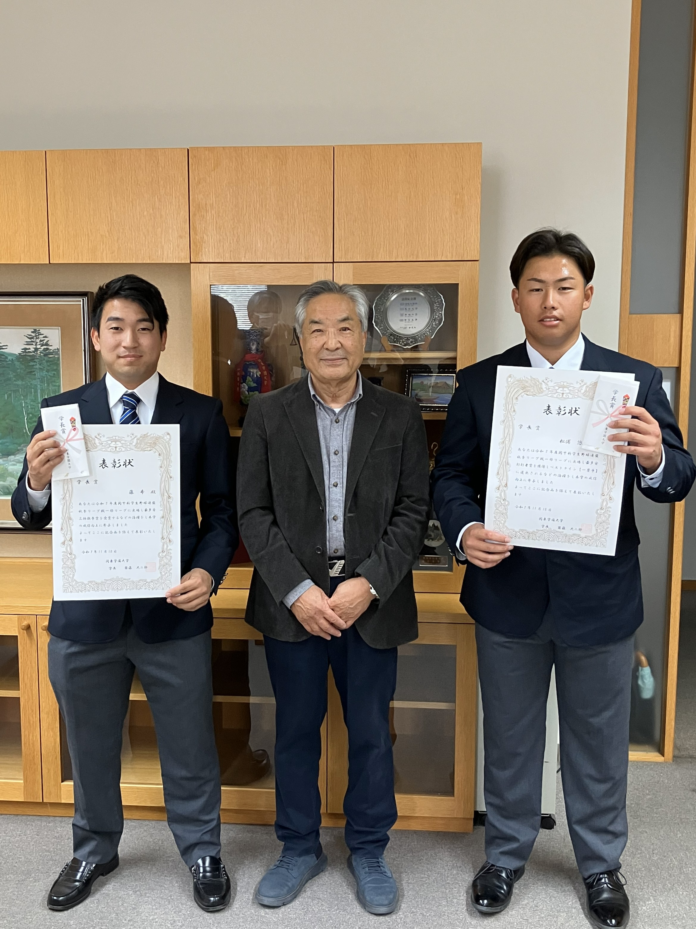 【硬式野球部】個人表彰された選手に学長賞を授与しました 2025.11.18 <002>ニュース&トピックス | クラブ活動 令和7年度関甲新学生野球連盟秋季リーグ戦1部において個人表彰された2選手が優秀な成績を残すなど大活躍し、本学の威信を高めたとして、齋藤学長より表彰されました。 藤 希さん(経営学科4年):「最多奪三振投手賞」を受賞。 松浦 悠馬さん(経営学科2年):「最多安打打者賞」を受賞、「ベストナイン【一塁手】」に選出。 今後も2人の活躍とともに硬式野球部の活躍が期待されます。