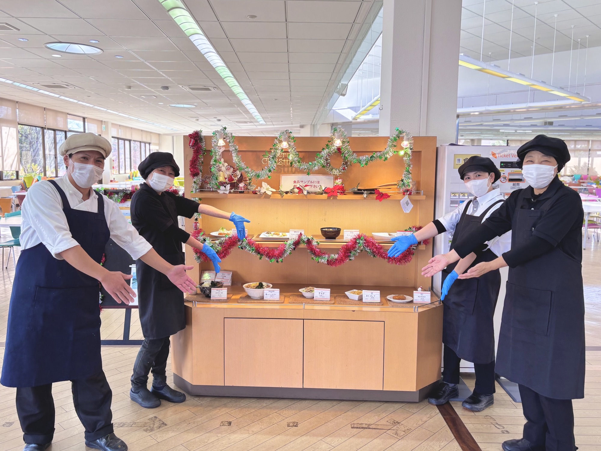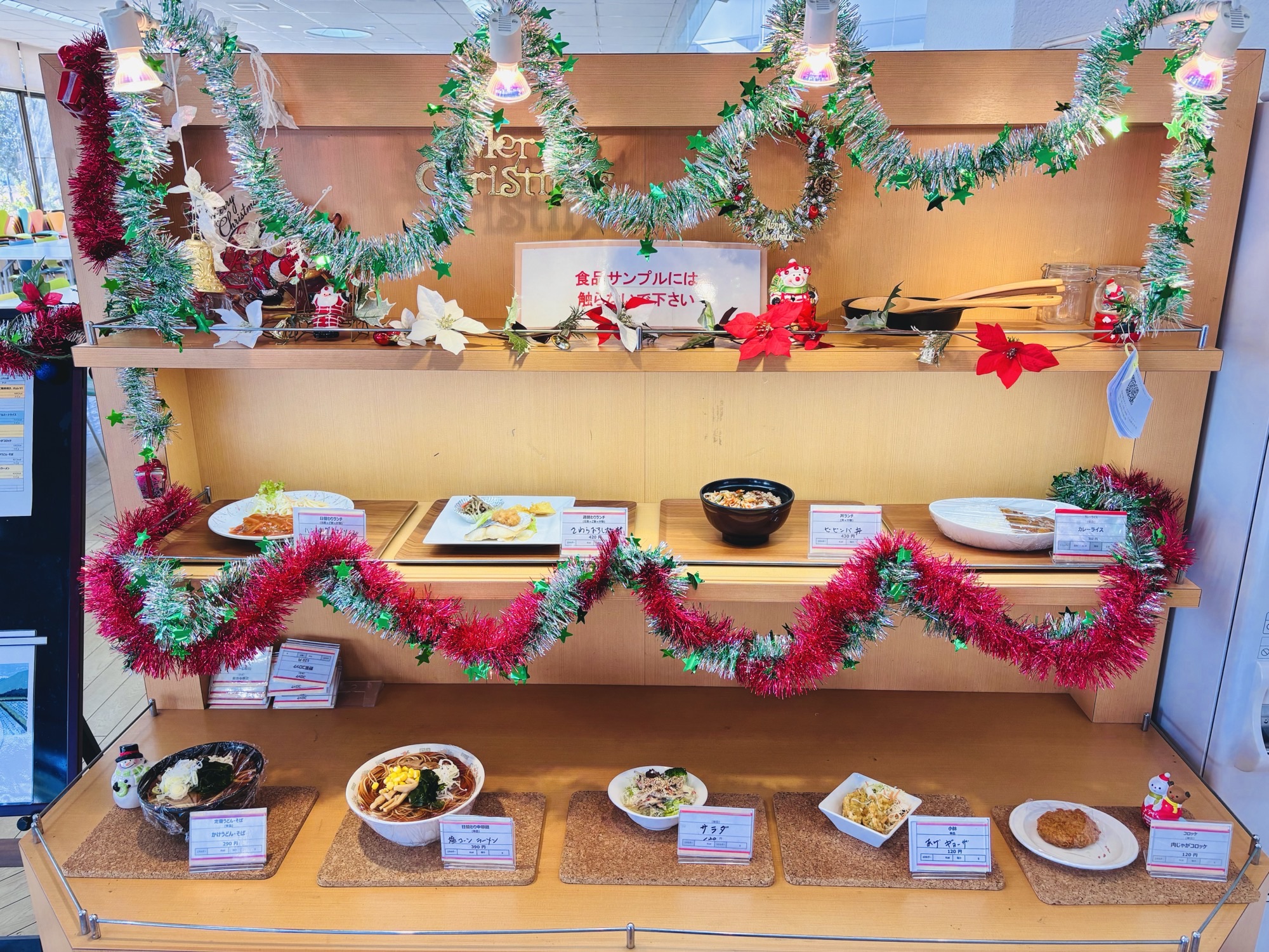 また、12月はキッチンスタッフのみなさんの心遣いで、メニューコーナーがクリスマスの装飾に変身!食堂に入るだけで、ちょっと気分が上がります🎅