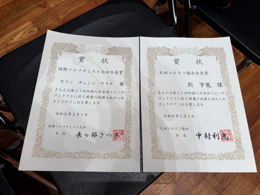 本学からは、経営学科国際ビジネスコース2年のモリン チェンジ ナリタさんと、同コース4年の劉宇龍さんが出場しました。二人とも健闘した結果、モリンさんは「国際ソロプチミスト太田会長賞」を、そして劉さんは「太田ユネスコ協会会長賞」を見事に受賞しました。レベルの高い発表者たちの中にあって、日本に暮らして感じたこと、会場内の聴衆のみなさんに伝えたいこと、将来の進路へ向けての決意などについて非常に高い語彙力を駆使しながら堂々と発表することができました。