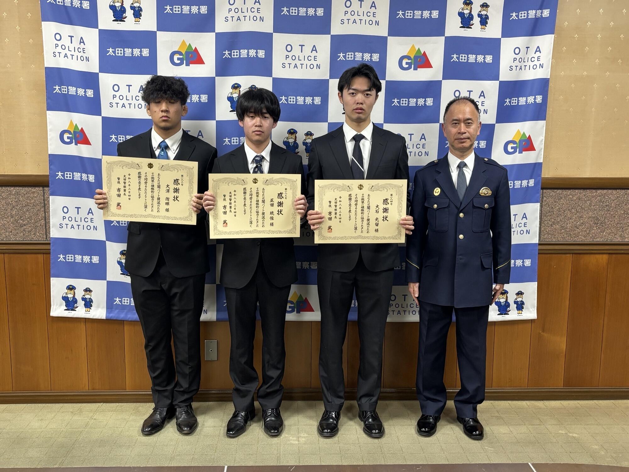 2月4日、太田警察署において、本学経済学科「警察・消防プログラム」1年生3名に対し、吉田武署長から感謝状が贈呈されました。